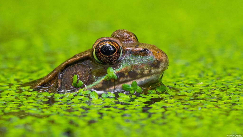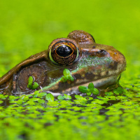 water lilies (or similar aquatic plant). This type of frog could be an American Bullfrog due to its size and coloration, although without more specific details it's difficult to identify