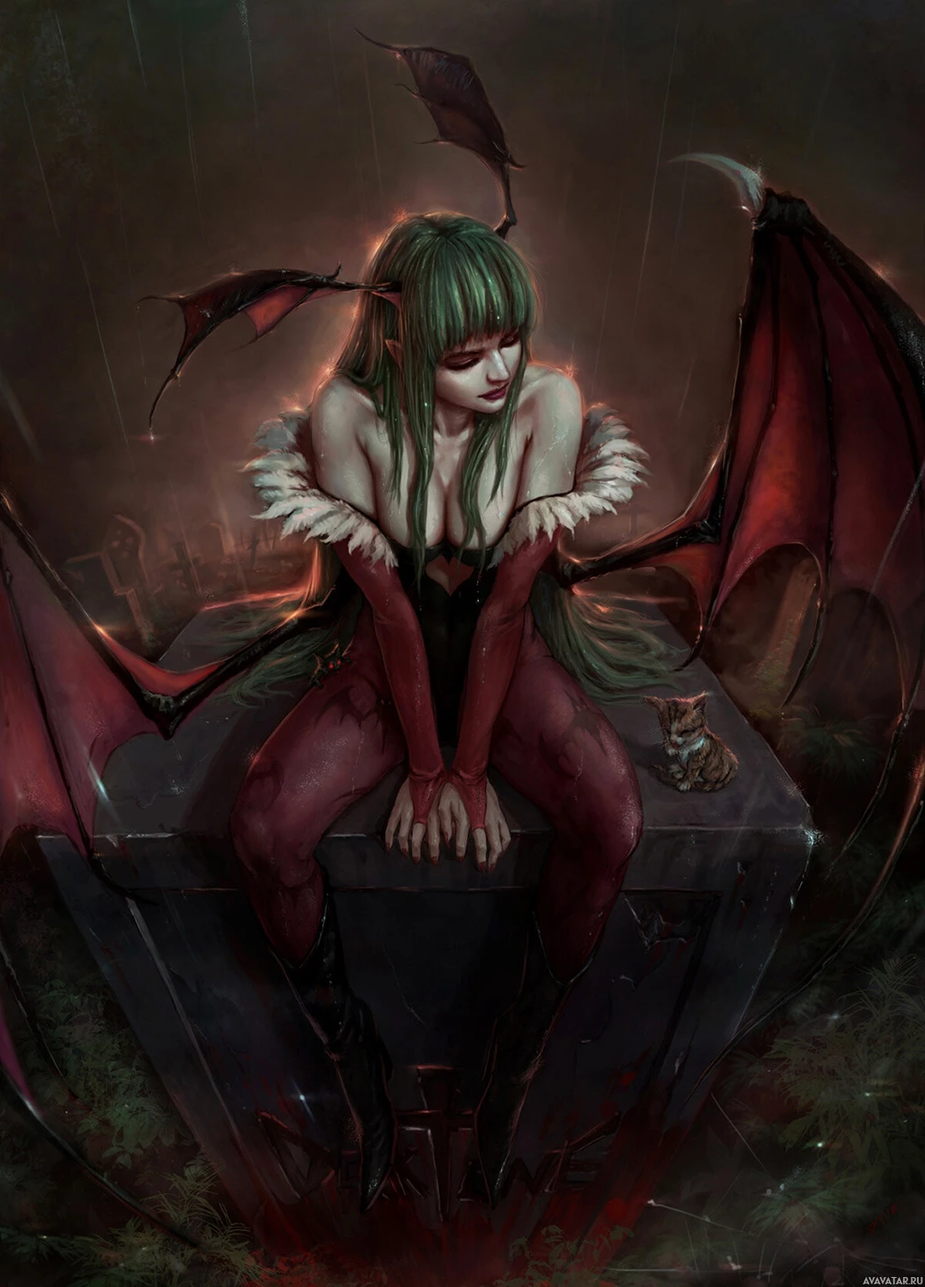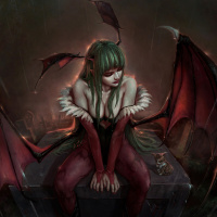 green hair, which is a common characteristic for such mythical beings in various cultures' folklore. It appears to have wings and horns, traditional representations of a succubus. The character is depicted sitting on a surface that could be interpreted as a block or a pedestal, set against a dark backdrop that suggests