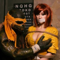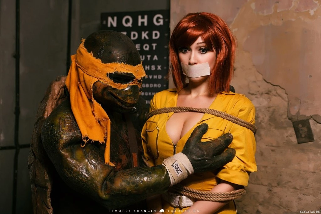 green skin. On the right, there is another person in an April O'Neil costume, which includes a yellow jumpsuit and