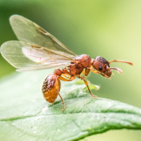 The image shows a bee, which is an insect commonly known as a pollinator for plants. It appears to be perched on a green leaf or stem in what seems to be a natural outdoor setting. The bee has distinct body segments with black and yellow markings characteristic of many species of bees.
