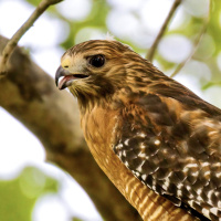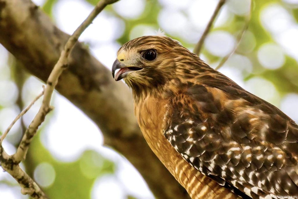 На фотографии изображена птица, а именно краснохвостый ястреб (Buteo jamaicensis), сидящий на ветке. Он отличается крупными размерами и характерными красными хвостовыми перьями.