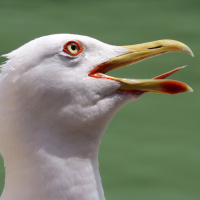 The image shows a bird, specifically a seagull, with its mouth open and beak slightly extended as if it is either vocalizing or yawning. The seagull has a white body and a grayish head, which are
