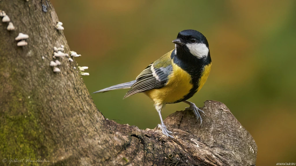 a tree branch. The bird has distinctive yellow and black plumage, which suggests it could be an American Goldfinch or a similar species. There are also visible mushrooms growing at the base of the tree, indicating that the photo might have been taken in a woodland or