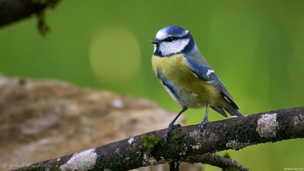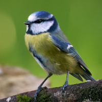 На картинке изображена маленькая птичка, похожая на синюю синицу. Она сидит на ветке дерева с зелеными листьями на заднем плане. У птицы ярко-синяя голова и крылья, контрастирующие с желтой нижней частью тела.