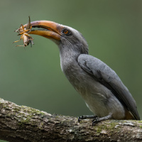 The image shows a bird perched on a branch with an insect in its beak. This is likely an example of avian feeding behavior, where birds often catch and consume insects as part of their diet.