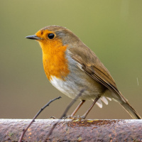 a metal structure. The bird has distinctive red and orange markings on its body, which is characteristic of the European Robin (Erithacus rubecula), commonly known as the robin. It's sitting in