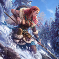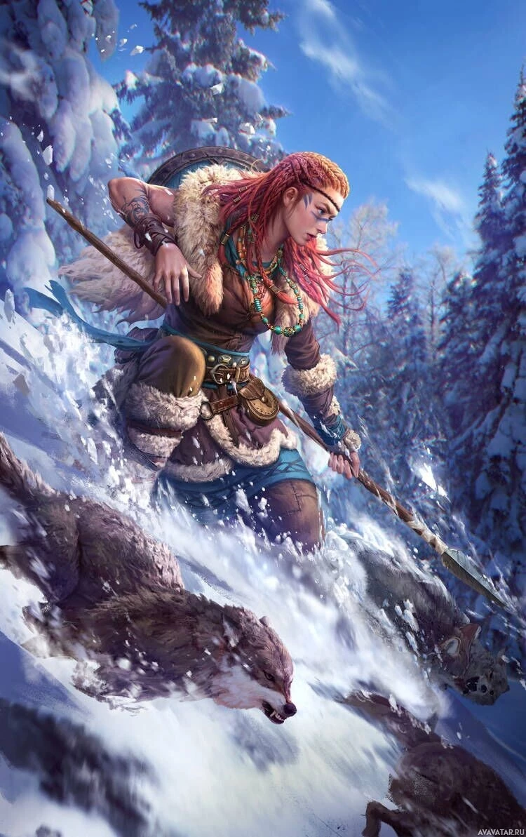 На картинке изображена рыжеволосая девушка, стоящая в снегу и держащая что-то похожее на копье. Она одета в зимнюю одежду, которая наводит на мысль о холодном климате, и окружена деревьями.