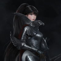 armor pieces that suggest strength and protection. The background is dark, enhancing the focus on the character's attire and pose. This character could also be described as a brunette based on her hair color.