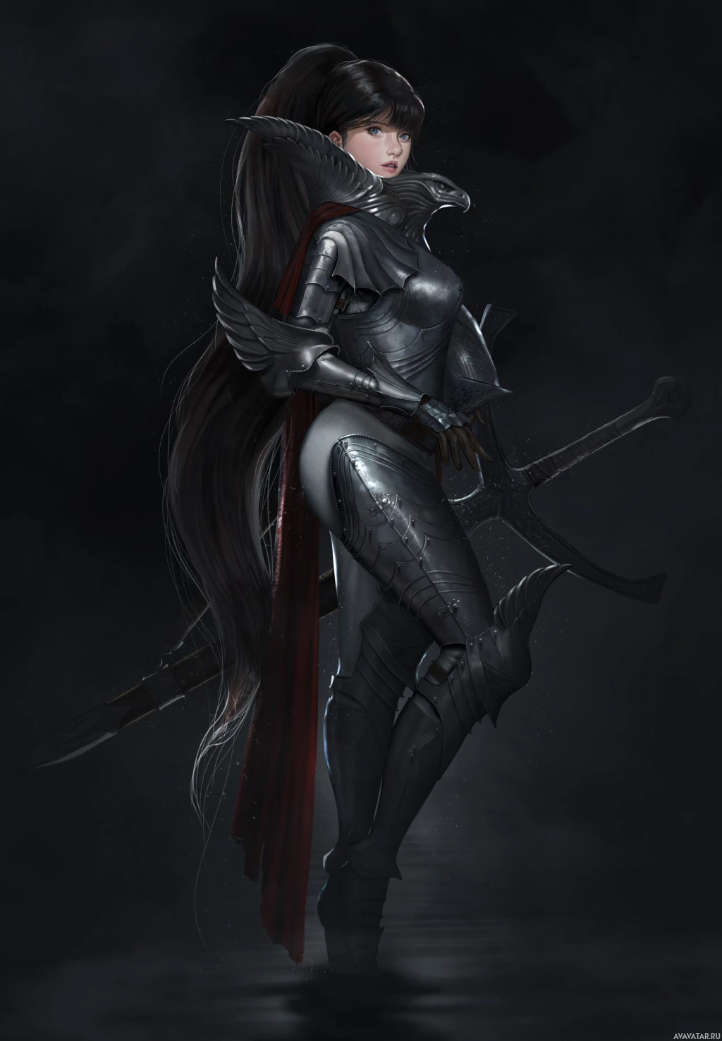 a female character with long, wavy hair. She appears to be a warrior or knight due to her armor and the weapon she holds in one hand, which seems to be