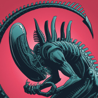 a vibrant background that has a red and purple gradient effect. This artwork captures the iconic design of the Xenomorph, which is often referred to as an "Alien," and it's recognized by fans and audiences alike for its role in