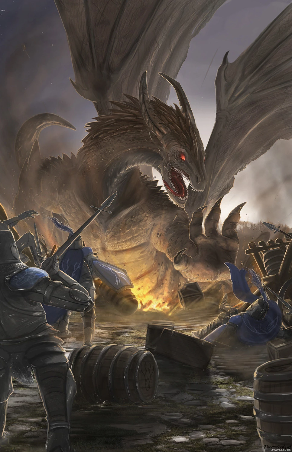 human warriors armed with spears, shields, and armor, standing ready for battle against the dragon. The setting looks like a medieval or fantasy village, with