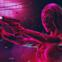 an urban environment, indicated by the neon signs and pink hues that give the image a vibrant, cyberpunk feel. The character is poised in a defensive stance, ready for action, which aligns with the science fiction theme often associated with