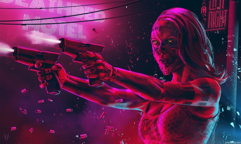 the science fiction genre, who appears to be a robot or android armed with pistols. The setting suggests a nighttime scene, possibly in