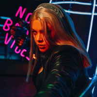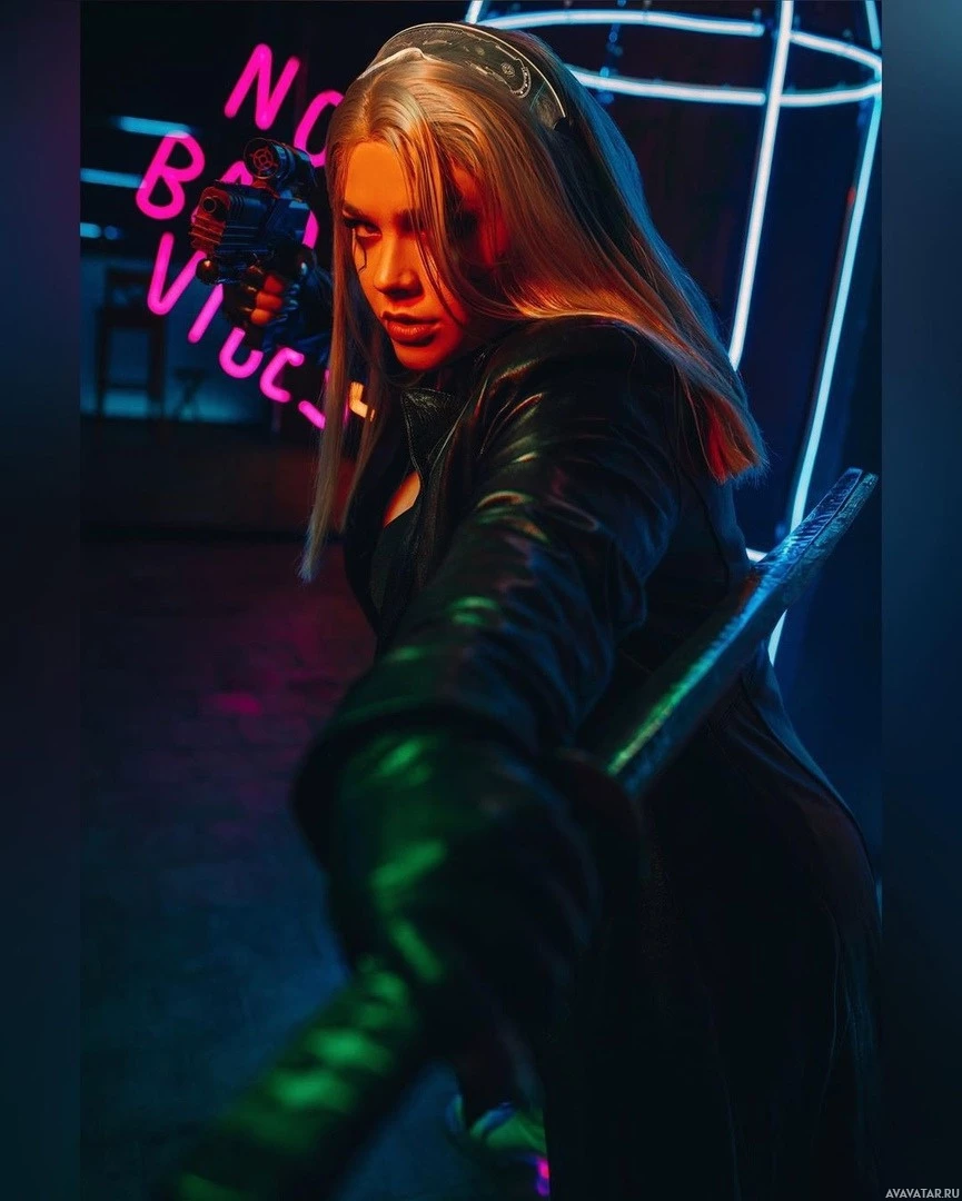 neon lights which enhance the futuristic ambiance of the scene. Her stance and the props suggest she may be portraying a character from a cyberpunk or sci-fi setting, possibly indicating that she is a performer, such as a singer, actor, or model.