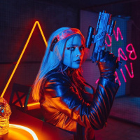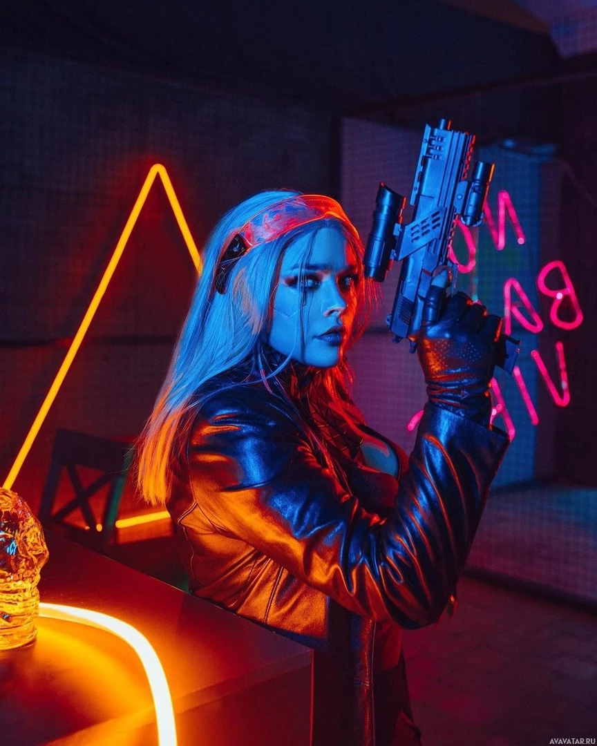 futuristic fashion, holding what appears to be a pistol. They are standing in front of a background that includes
