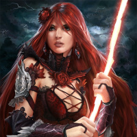 a female character with long red hair and dark clothing, which suggests she might be from the fantasy or gaming genres. She is holding a staff or wand in her right hand and appears to be casting magic or a spell due to