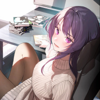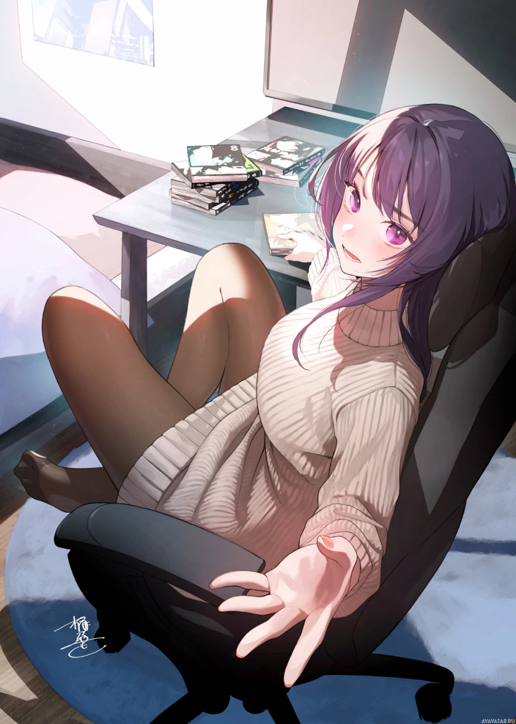 На картинке изображен анимационный персонаж, который выглядит как молодая девушка с фиолетовыми волосами. Она сидит на стуле, слегка наклонившись вперед и положив руки на стол перед собой. Выражение ее лица кажется веселым или возбужденным, когда она смотрит на зрителя. Обстановка наводит на мысль о домашней обстановке, возможно, это место для учебы, учитывая наличие книг и чего-то похожего на компьютерный монитор на письменном столе.