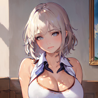 blonde hair. She is wearing a blue and white uniform with what seems to be a logo on the right side of her chest, suggesting she might be part of an organization or team. The character is sitting down in