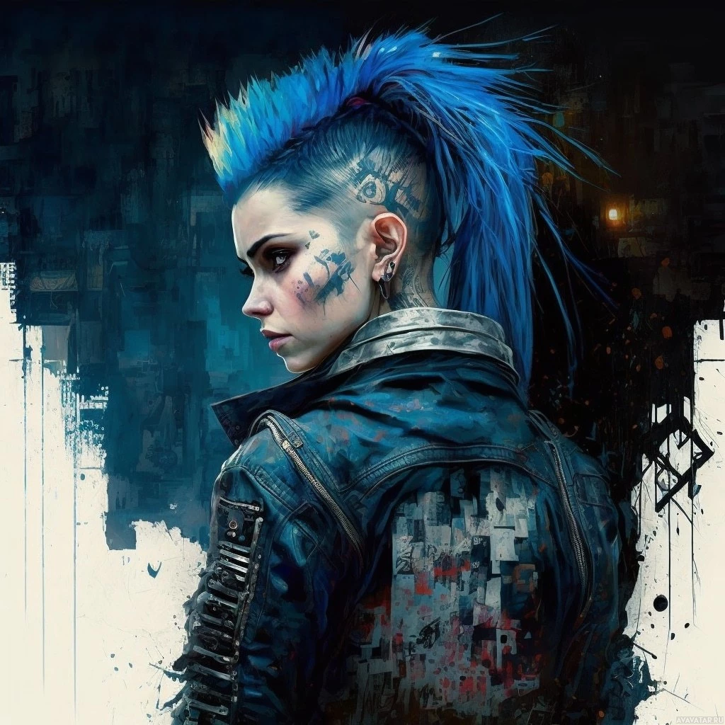 blue hair styled in dreadlocks, and there are visible tattoos on her face. She has