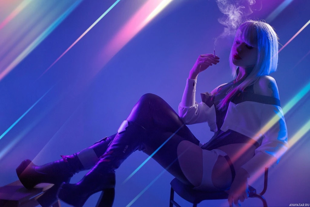 blonde hair and is wearing tight clothing that includes a leather jacket, boots, and thigh-high black boots with a noticeable heel. They are smoking a cigarette, which adds to the overall