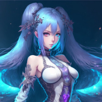 a young woman with blue hair and a stylized appearance. She has prominent features such as cat-like ears on top of her head and horns, suggesting that she might be a fantasy or anime-inspired design. Her outfit includes what appears to be armor or a battle-