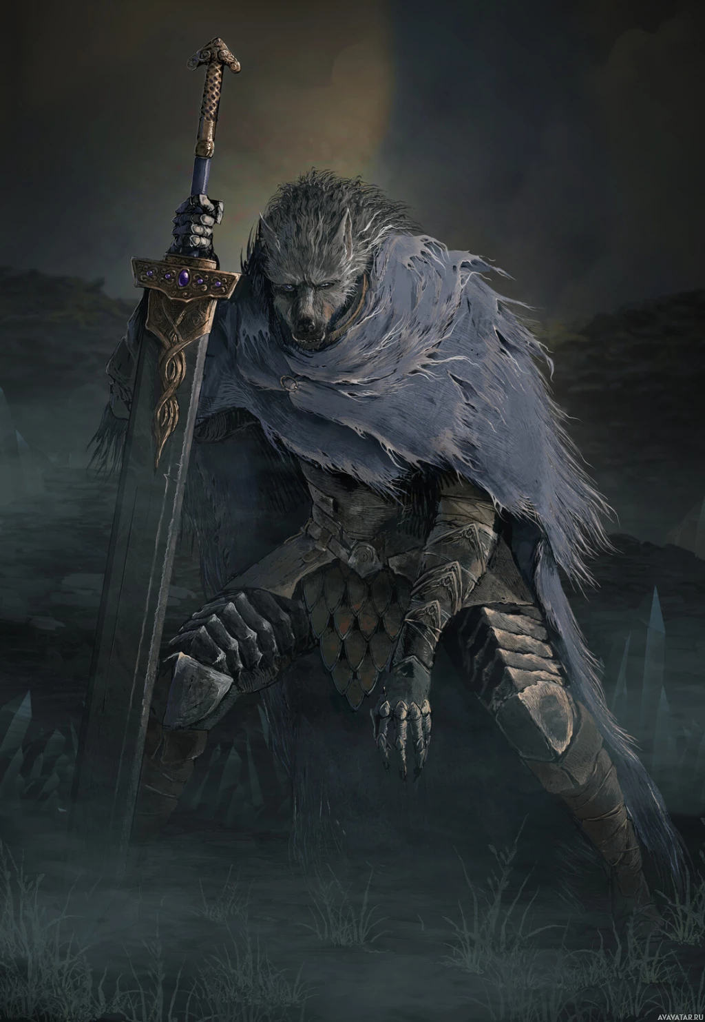 The image depicts a fantasy-themed character, possibly a werewolf given the context of fantasy and sword. The character is wearing armor that appears to be made of metal and leather, suggesting a medieval or fantasy setting. They are holding a sword with