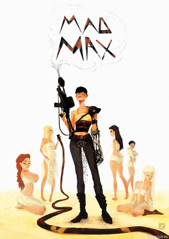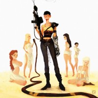 an illustrated character, a woman standing with her arms crossed, dressed in what appears to be a stylized costume that could suggest she is portraying a character from the movie "Mad Max: Fury Road." Behind her, there are other characters that look like they could be part of the same universe or cast. The text "