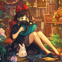 an animated character, a young girl with brown hair, sitting outside at night. She is reading a book, which could be