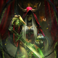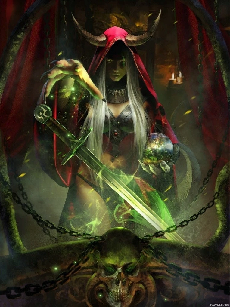 an air of confidence and power. Additionally, there are glowing green chains and skulls at the base of what appears to be a throne or altar, enhancing