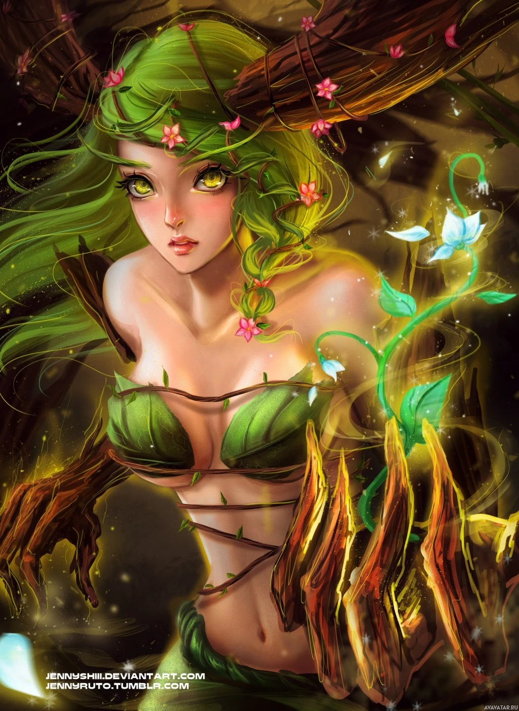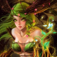 mythical being, possibly a dryad as you've mentioned. Dryads are known for their association with trees and nature. The character is depicted wearing what seems to be a leafy garment that blends in with the foliage around her, suggesting she might have