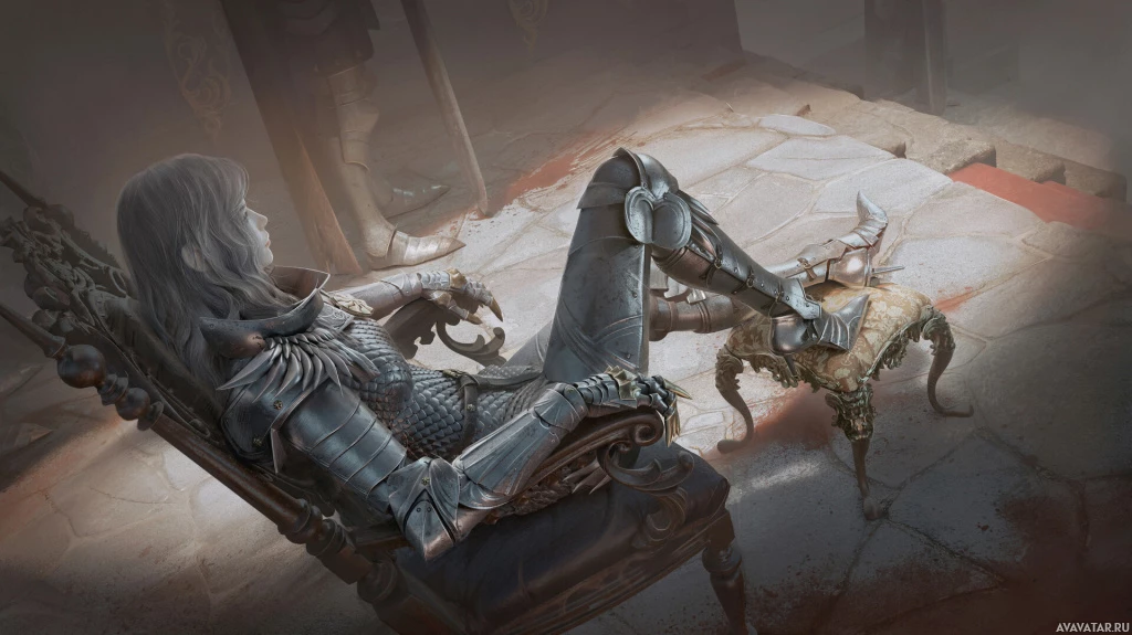 a fantasy setting. This character is seated on a throne-like chair with their leg crossed over a resting creature that could be a dog or