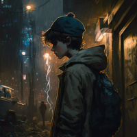 street at night. It appears to be a stylized or artistic rendering rather than a realistic photograph. The person is wearing a light jacket and has a backpack slung over their shoulder, suggesting they might be out for