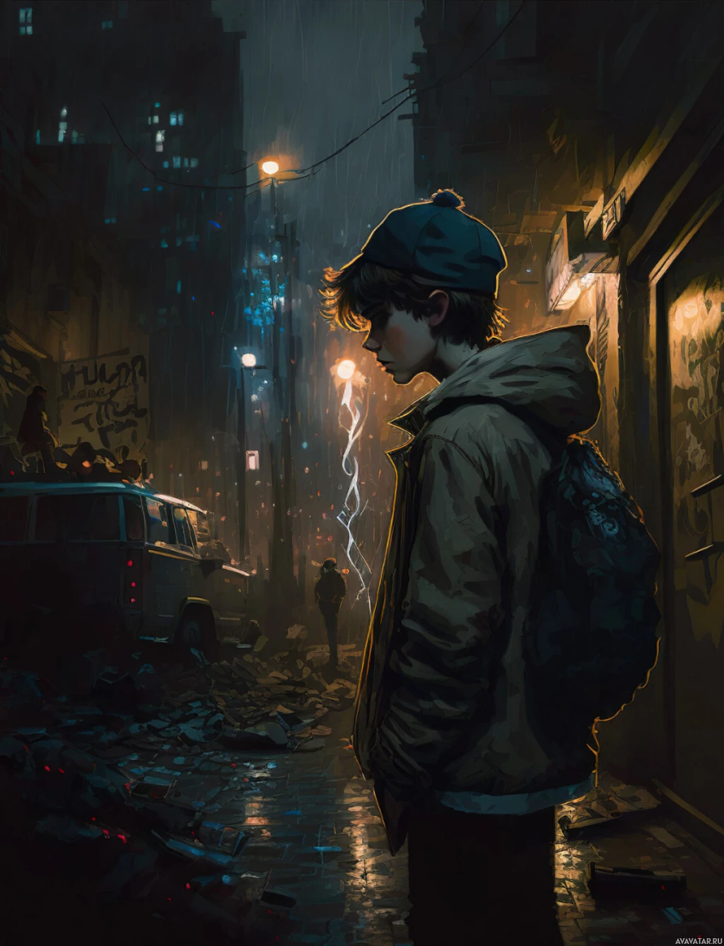 an evening walk or waiting for someone or something. The cityscape around them looks dilapidated, with crumbling buildings, litter on the ground, and general