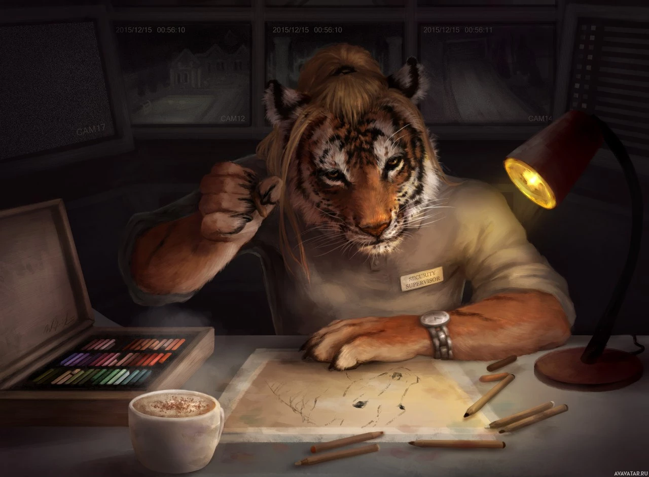 The image features an anthropomorphic tiger sitting at a desk in what appears to be