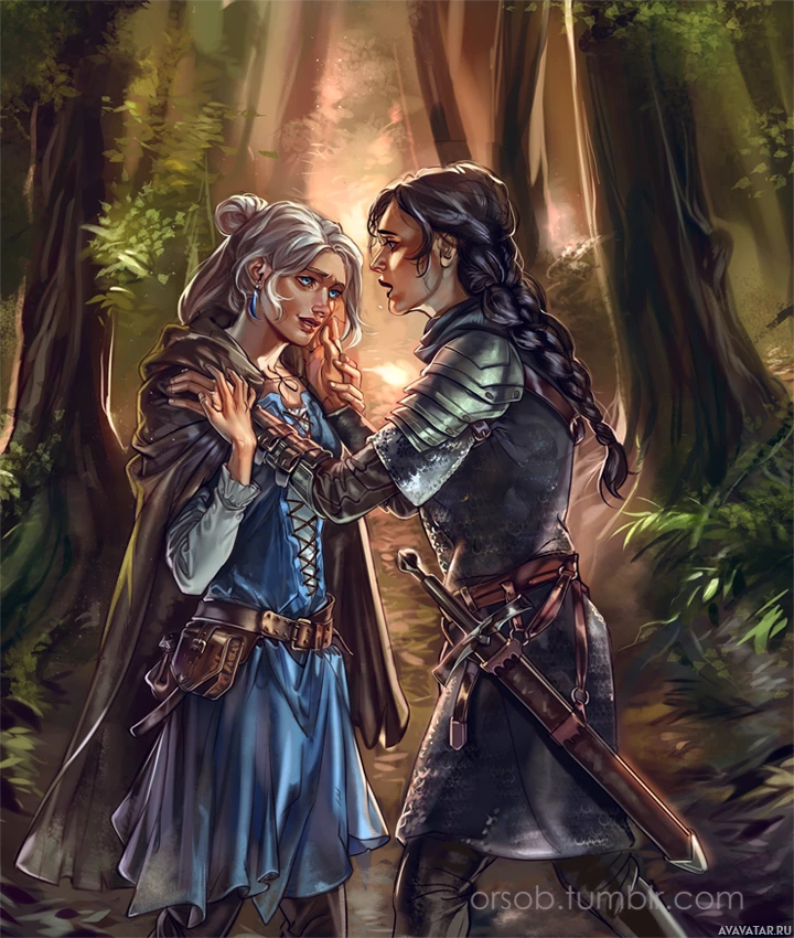 an emotional interaction between them. The background features trees and what seems like mist or low-hanging clouds, contributing to the mystical atmosphere of the scene.