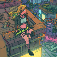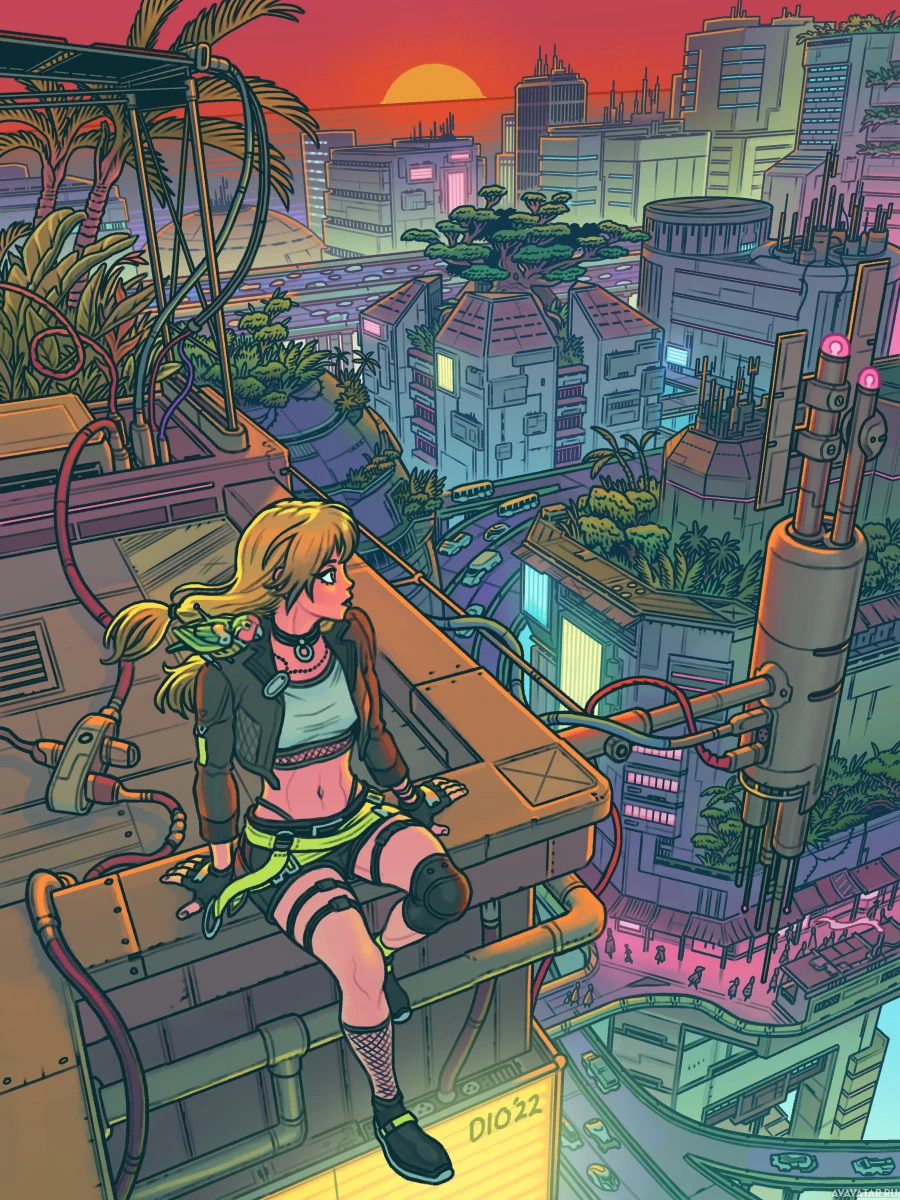 an urban setting during what looks like either sunrise or sunset, given the warm hues in the sky. The cityscape around her includes various structures and signs, suggesting a futuristic or