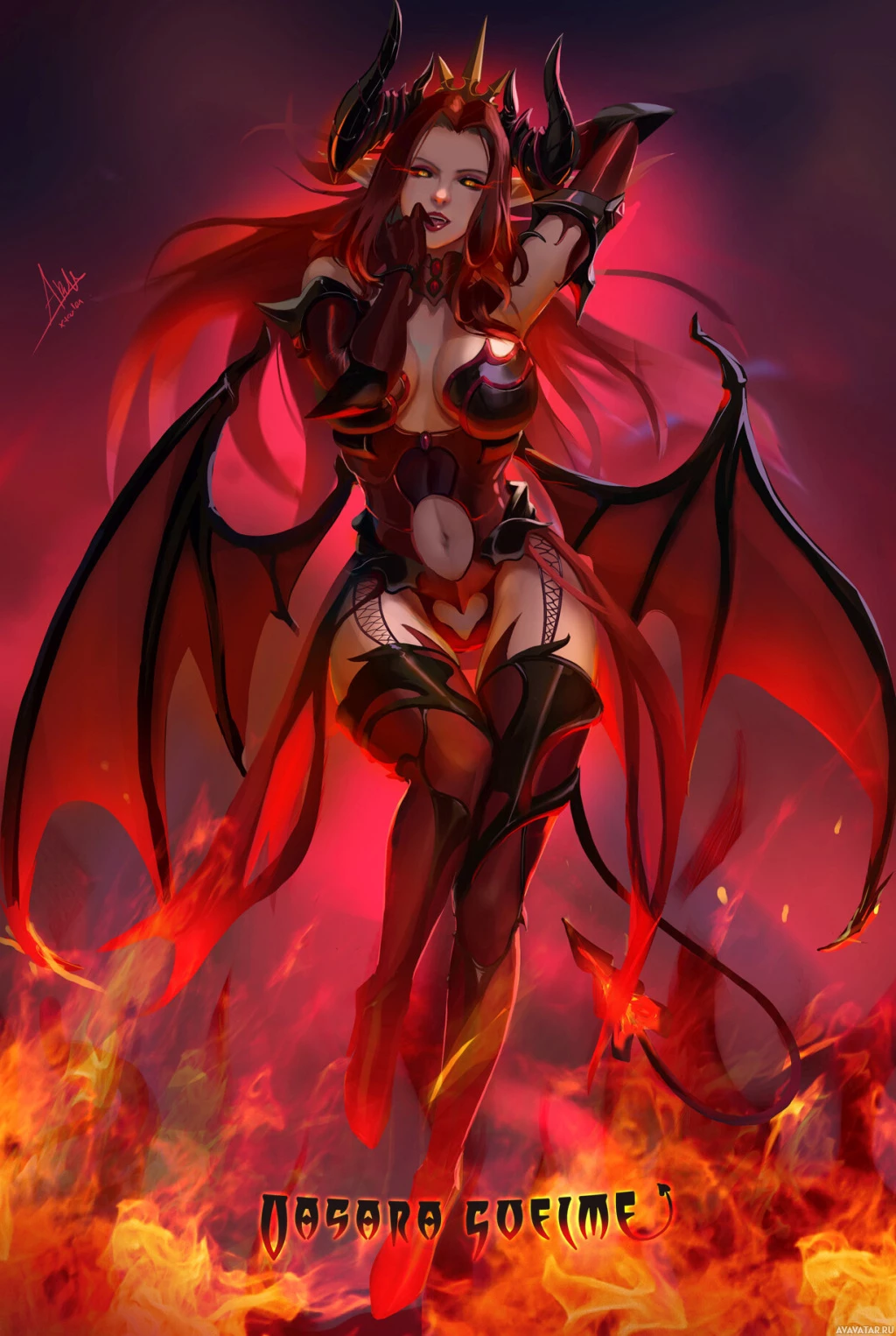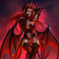 red hair, is wearing horns, and is dressed in a form-fitting outfit that includes demonic elements like wings and what seems to be flame effects around her. The background is dark with what looks like fire at the bottom, contributing to a dramatic and fantasy-themed atmosphere.