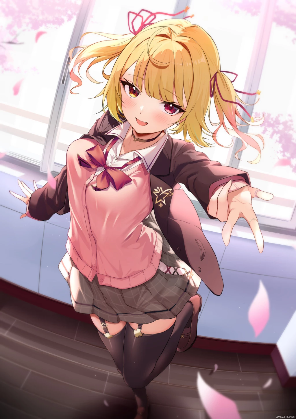 a school uniform that includes a tie and has her arms spread out as if she's in motion or expressing joy. There are