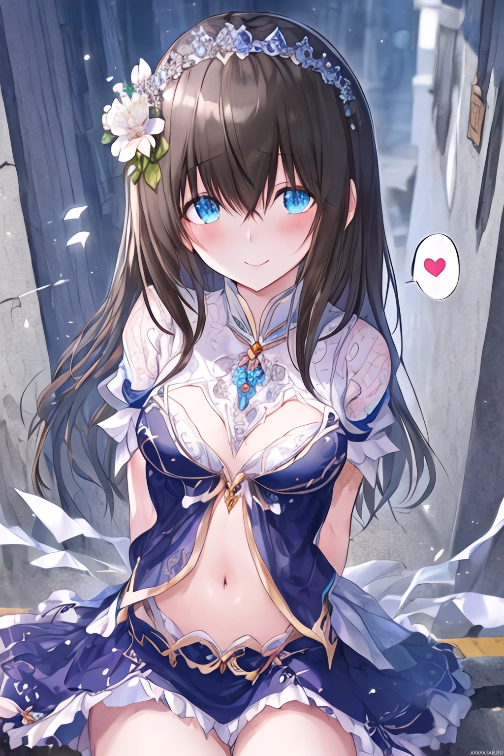 blue eyes and a cheerful expression on her face, which could be interpreted as shyness or bashfulness. There's also a flower emoji placed next to the character, which is commonly used in communication to convey emotions such as love or affection.