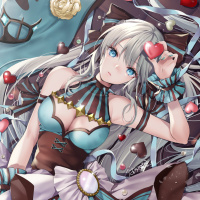 female character with white hair and a fantasy-style outfit. She is surrounded by various sweets, including