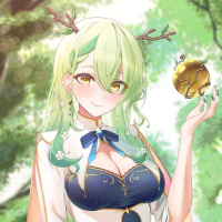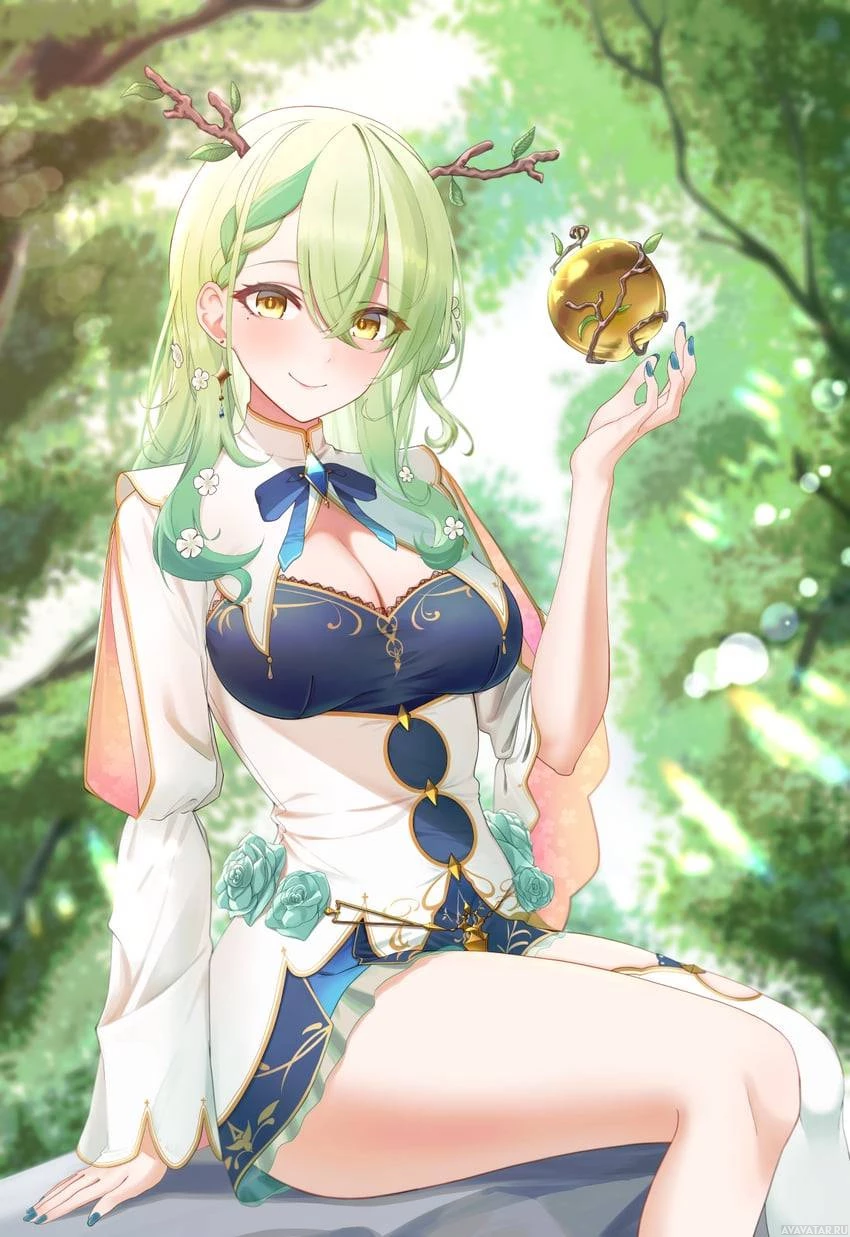 На картинке изображен анимационный персонаж, девушка с зелеными волосами, одетая, по-видимому, в традиционную китайскую одежду. У нее есть аксессуары, напоминающие оленьи рога, а в руке она держит небольшой золотой предмет. На заднем плане изображена естественная обстановка, возможно, лес или сад.