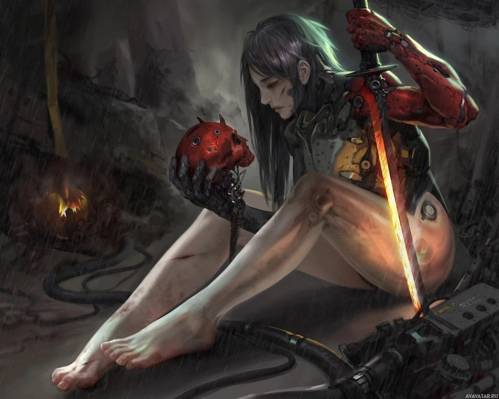a red sword in one hand and is holding what looks like a severed head in the other hand. There's a robotic or mechanical arm on her left side. The setting seems post-apocalyptic with a bleak, dark atmosphere, possibly suggesting a dystopian or