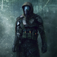 body suit with a respirator and hood, which suggests they are in an environment that requires protection from hazardous conditions such as toxic gases or extreme weather. The character is standing amidst what appears to be an industrial or dystopian setting, possibly indicating a scene from