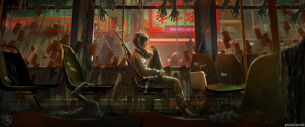 various objects scattered around, like chairs and tables, which suggests this is a public space. The style of the image leans towards realism with