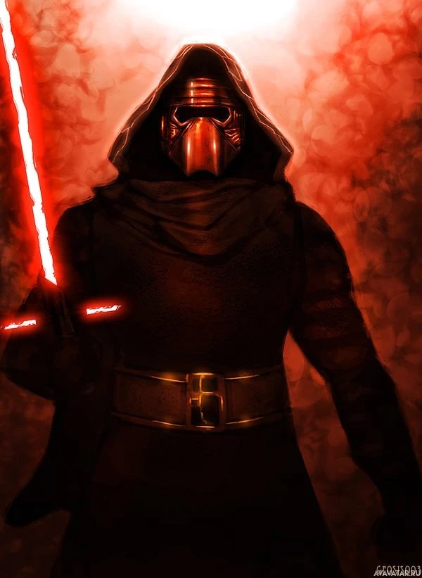 distinctive mask and dark robes. He's wielding a red lightsaber, which is iconic to Sith characters in