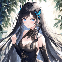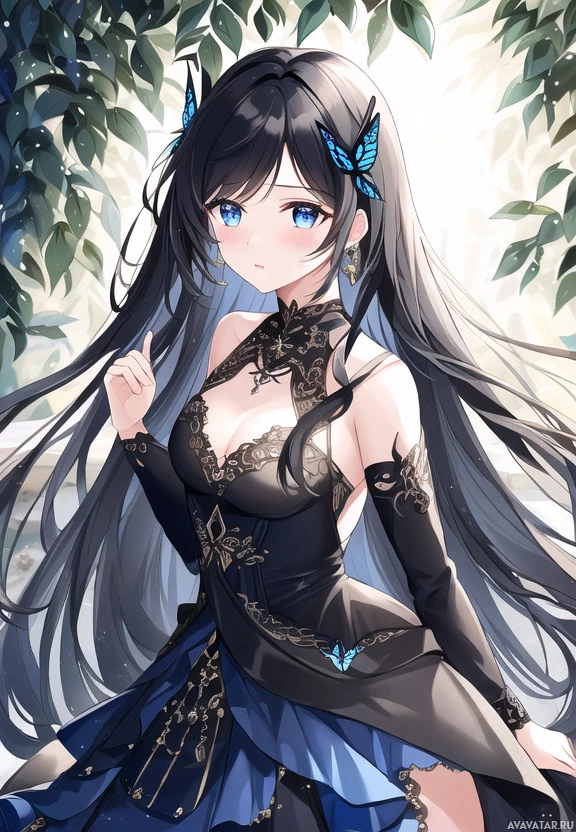 blue eyes and is wearing elaborate clothing that includes a dress adorned with intricate designs. There are butterfly-like accessories on her hair and ears. The background suggests
