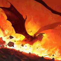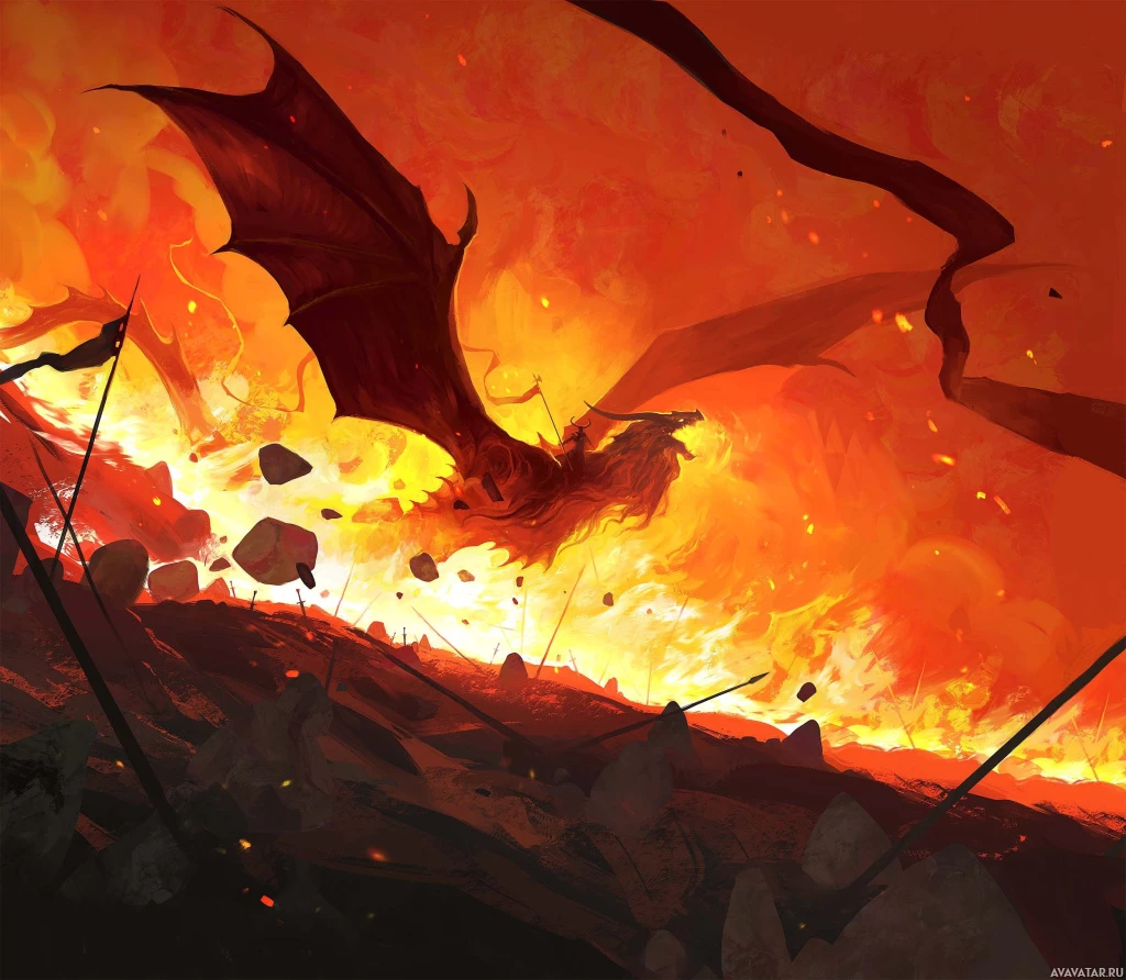 a dramatic pose with its wings spread wide, possibly in the act of taking flight or roaring at something. The background is engulfed in flames and smoke, suggesting