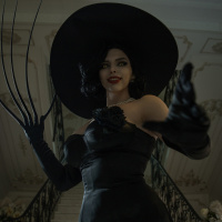 the video game "Resident Evil Village." She is depicted in a dramatic pose, with her fingers stretched out towards the viewer and dressed in an extravagant costume that includes