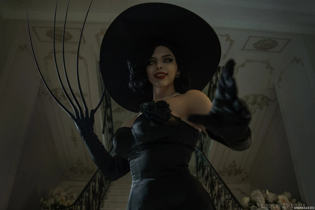 The image shows a character who appears to be Lady Dimitrescu from