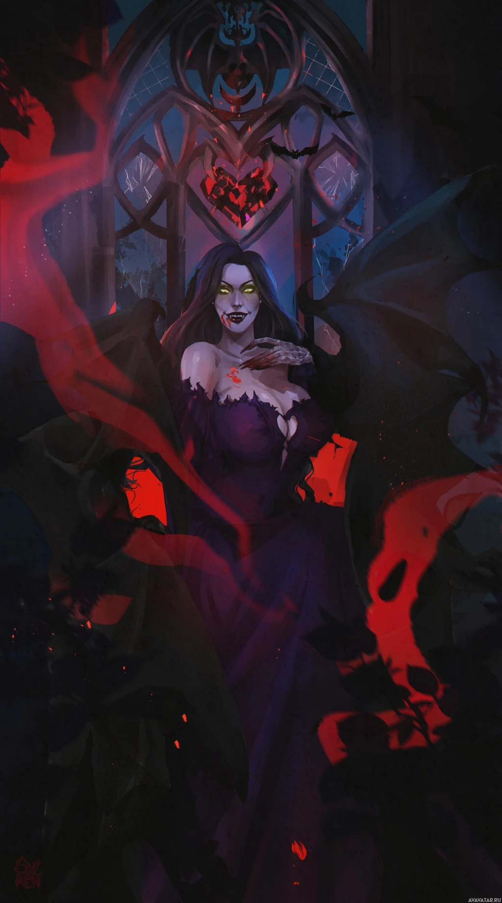На картинке изображен персонаж вампирской тематики в стиле фэнтези. Вампир изображен в зловещей и драматичной позе, с красными акцентами, которые могут символизировать кровь или энергию, на темном фоне, создающем готическую или сверхъестественную атмосферу.